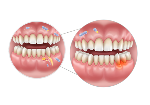 Illustration showing healthy teeth with bacteria and unhealthy teeth with inflamed gums and plaque buildup.