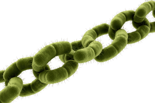 A microscopic chain of green, rod-shaped bacteria-like organisms with hairy surfaces, symbolizing interconnectedness, strength, and biological complexity. Scientific illustration. background removed