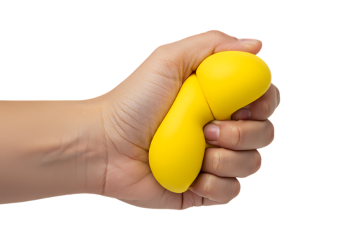 Closeup of a Hand Squeezing a Yellow Stress Ball isolated on transparent background
