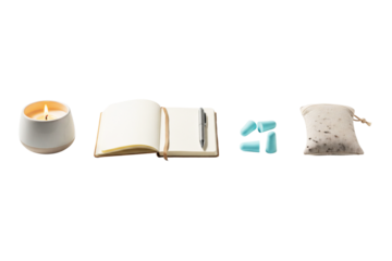 Mental Wellness Set. Candle, Journal, Earplugs, and Lavender Sachet on White Background or Transparent PNG