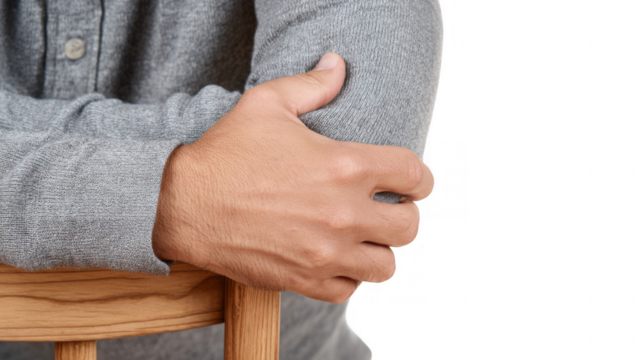 Close up of a man's hand tightly gripping an armrest, conveying feelings of anxiety, stress, or tension, isolated on a transparent background