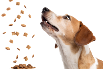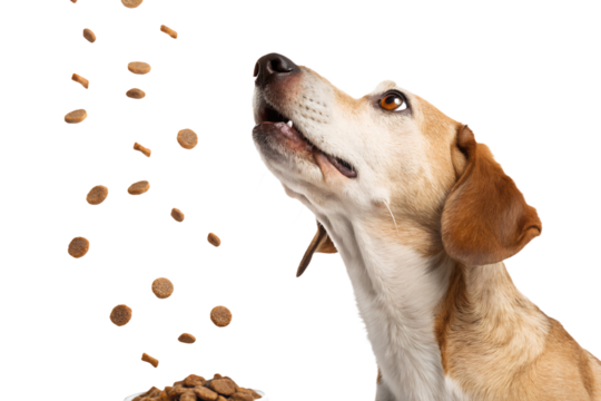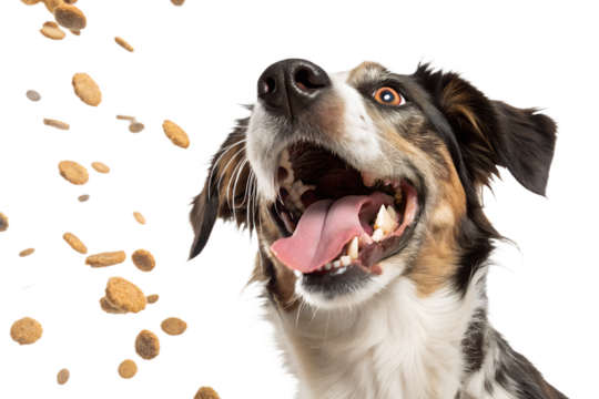Realistic dog portrait, medium close-up, dog looking up and trying to catch falling dry dog food, kibble pieces frozen in mid air, dynamic action moment, natural facial expression, realistic fur textu