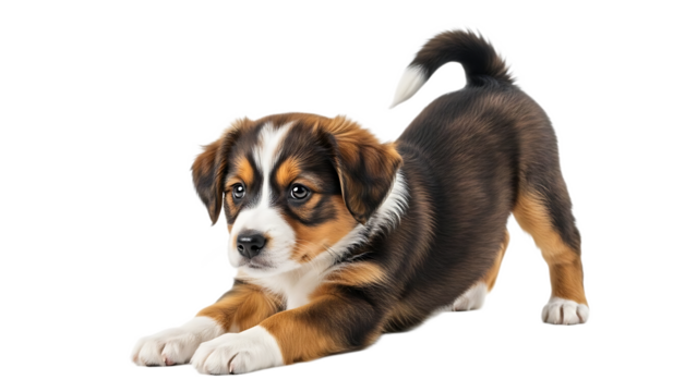 A playful puppy stretching with its front paws extended on a black background in a studio shot