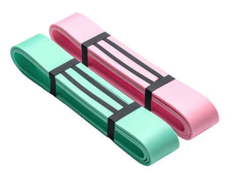 Two exercise resistance bands, mint green and pale pink, stacked horizontally.  Black accents