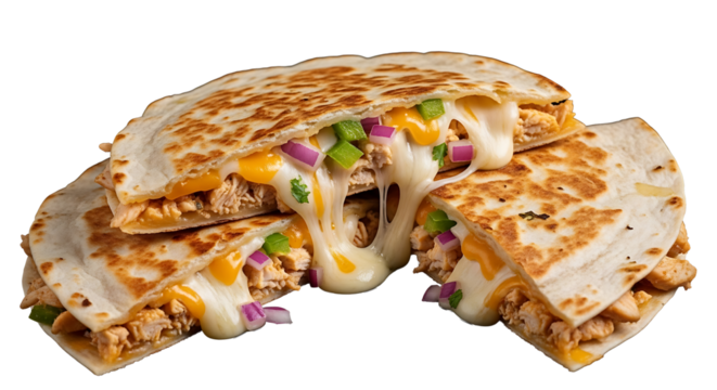 Delicious looking stacked chicken quesadillas with stringy cheese on transparent background