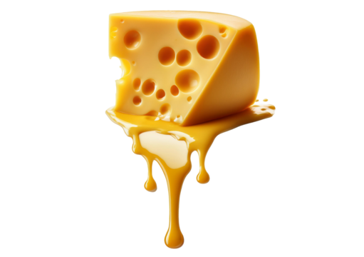 A triangular block of melted cheddar cheese with stringy drips and holes on a black background