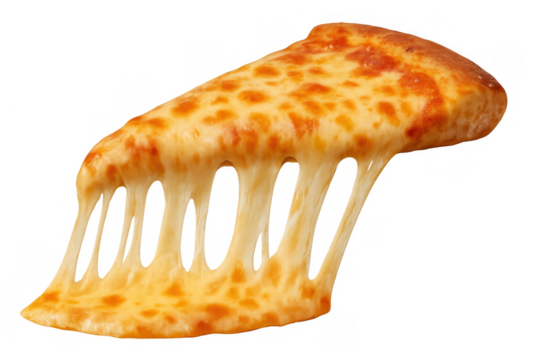 Pizza slice pulling stringy melted cheese, mozzarella topping, classic italian fast food, transparent background