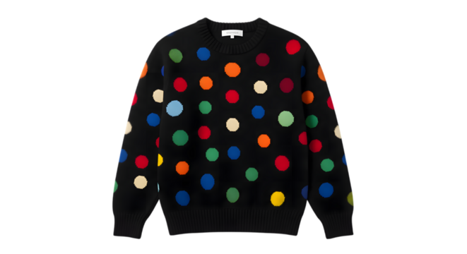 Colorful knitted sweater hanging against a white background, showcasing vibrant stripes and a cozy design, perfect for autumn or winter fashion.