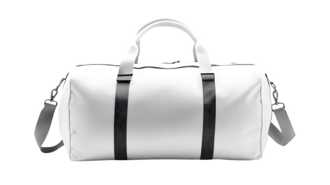 A beach bag with blue stripes and a hat with towels and sunglasses on a transparent background