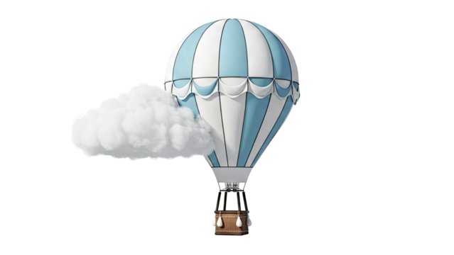 Blue and white striped hot air balloon isolated PNG, vintage wicker basket travel