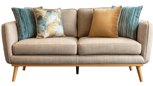 Comfortable beige upholstered two seater sofa featuring stylish decorative throw pillows on transparent background