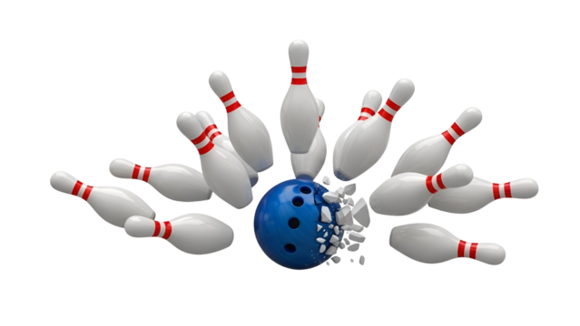 A vibrant depiction of a blue bowling ball impacting white pins with red stripes ideal for digital projects on transparent background