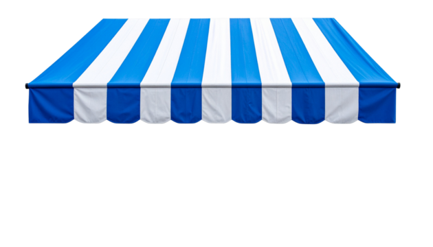 A blue and white striped awning designed for outdoor shade and protection from the elements.
