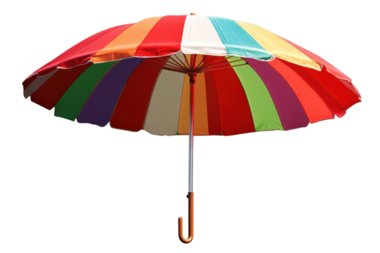 Brightly colored beach umbrella standing tall with a striped canopy, perfect for sun protection at a seaside location on a sunny day