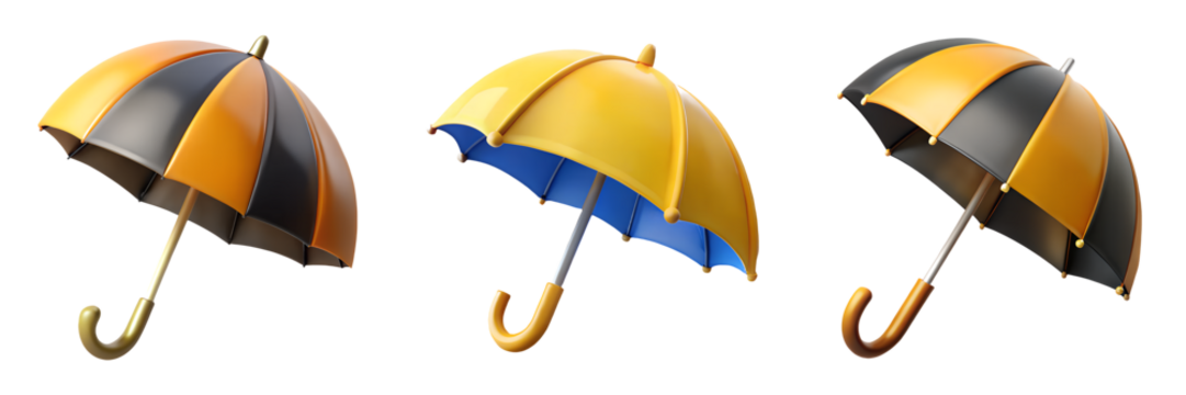 Three vibrant 3D umbrella icons in yellow and black patterns, isolated on a transparent background, representing weather protection, autumn seasonal accessories, and outdoor shelter solutions