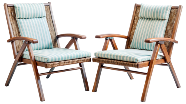 Wicker armchairs with beige and white striped cushions isolated on a transparent background