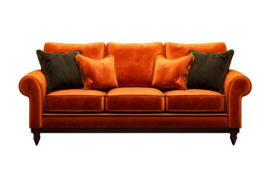 Top view yellow sofa with pottery strip cushions isolated on transparent background
