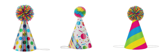 Colorful party hat set with pom-poms isolated on white background. Polka dot and striped birthday cone hats for kids' celebration, carnival, and festive event decor.