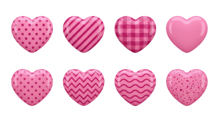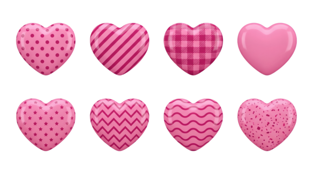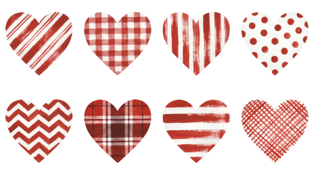 Red patterned heart set including stripes, polka dots, gingham, plaid, chevron, and crisscross designs. Hand painted watercolor decorative valentine element collection.