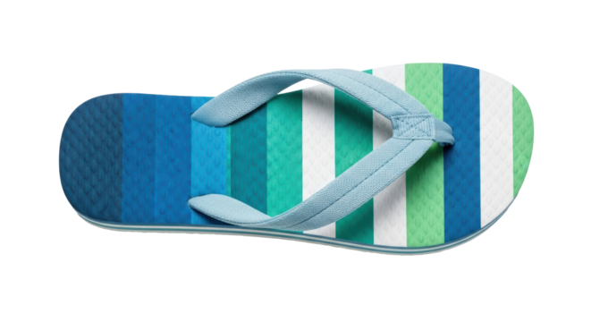 Colorful flip-flops with striped pattern, perfect for beach or poolside, isolated on white background, PNG format, top view