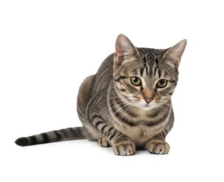 A tabby cat with striped fur and green eyes, sitting on a white surface with a white background.