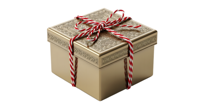 Gift - Elegant gold gift box with textured lid and red and white striped ribbon, perfect for luxury presents or special occasions