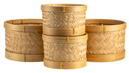 Four woven cylindrical containers, likely food baskets, of varying sizes, against a black background