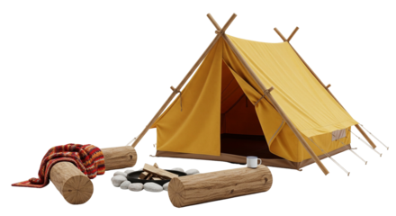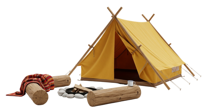 Yellow Canvas Tent with Campfire and Logs in Outdoor Camping Setup