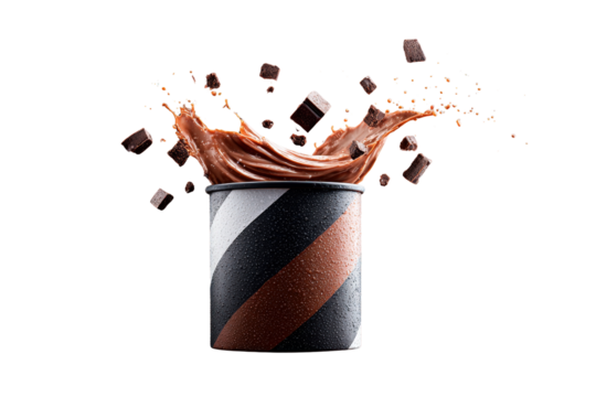 Chocolate Drink in Black and Copper Striped Mug with Splashing Liquid and Cocoa Cubes