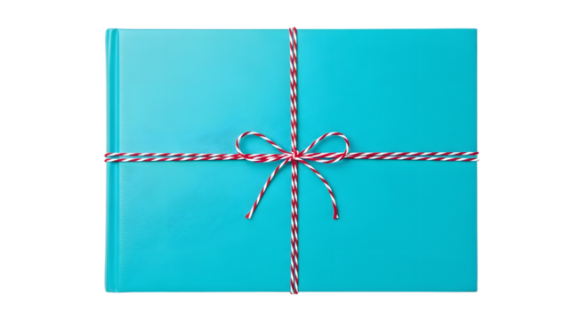Gift - Blue wrapped gift box tied with red and white striped string bow isolated on white background, perfect for birthday or holiday celebrations