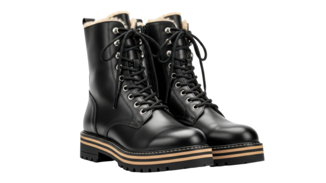 Pair of stylish insulated leather boots with fur lining and lug soles on a transparent background PNG image PNG file for winter footwear