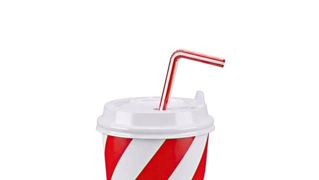 A red disposable cup with a white rim and a red and white striped straw on a black background isolated on transparent background