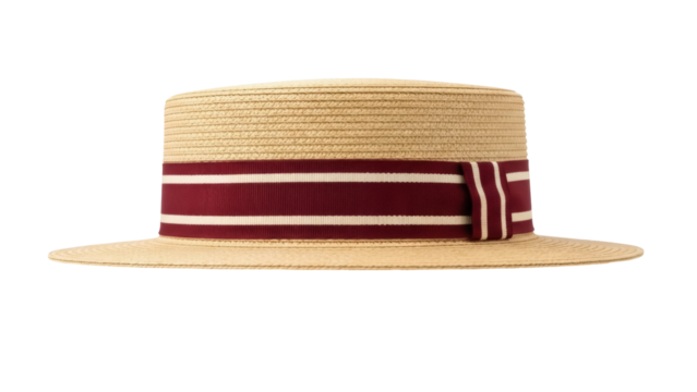 Boater hat isolated PNG on transparent background, classic straw hat with maroon and white striped ribbon for summer fashion