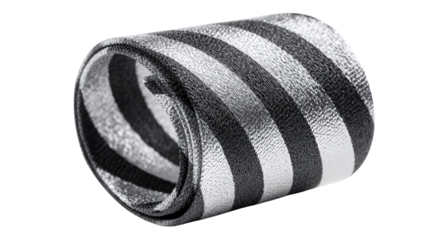 Striped Silver Tie: A visually striking silver tie with bold black stripes, expertly folded and presented in a professional setting.