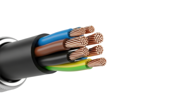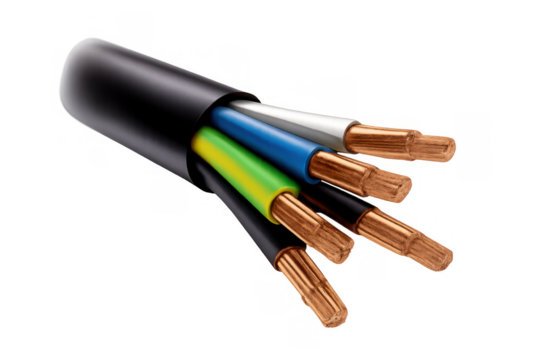 Electrical cable with stripped insulation displaying multiple copper wires, connecting power and transmitting energy