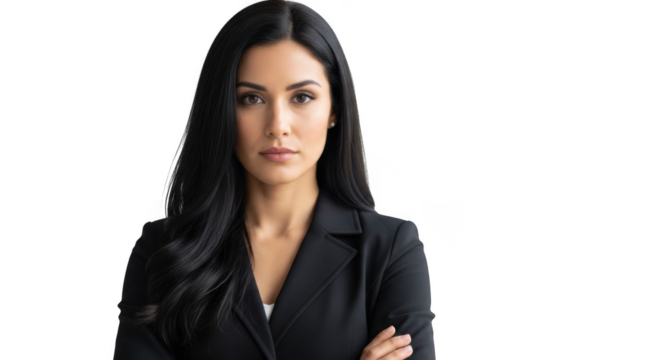 A young female African businesswoman in a power suit, standing confidently, white background.