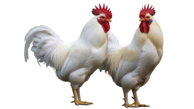 Two white roosters with red combs and wattles standing side by side isolated on transparent background