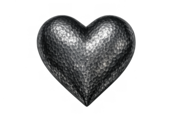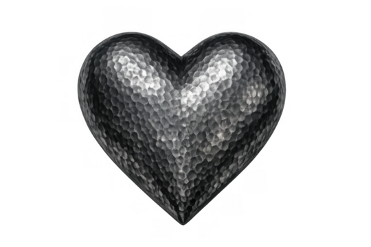 Metallic heart depicting enduring love and strong emotions with hammered steel texture on transparent background