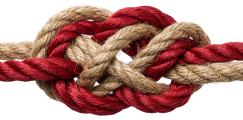 close-up of a knot made with red and beige ropes isolated on a transparent background