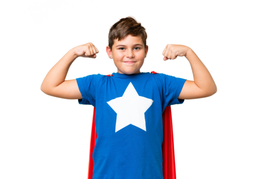 Little caucasian kid over isolated chroma key background in superhero costume and doing strong gesture