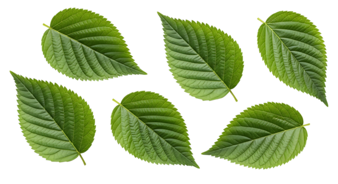 Six vibrant green serrated leaves with prominent veins and stems isolated on a transparent background