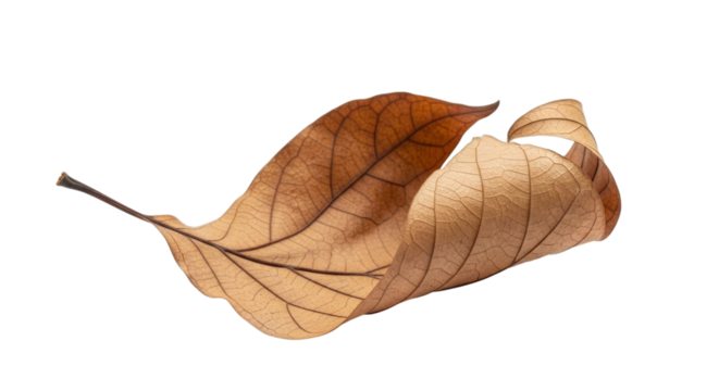 A single curled brown leaf with prominent veins on a plain setting on transparent background