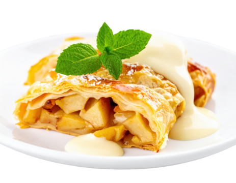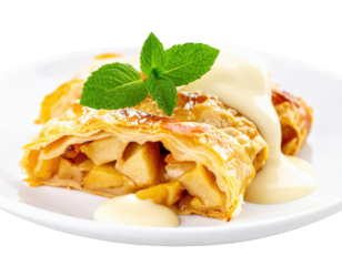 Flaky apple strudel slice with creamy vanilla sauce powdered sugar and fresh mint garnish.