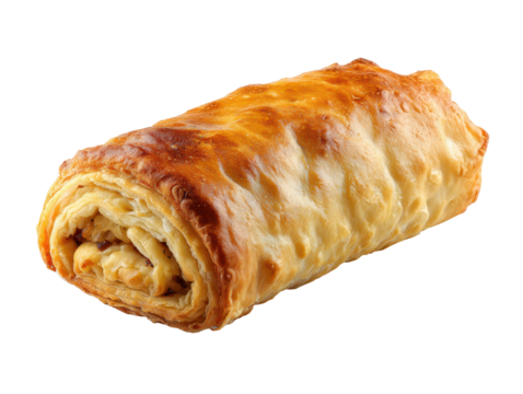 Baked savory strudel pastry roll with golden flaky crust, layered baked texture and lightly browned finish with crisp edges, isolated on transparent background.
