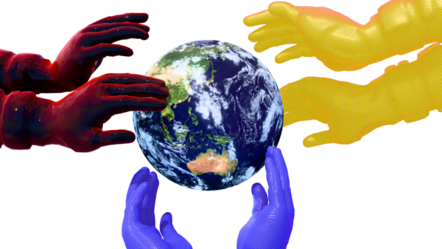 Geopolitical power struggle concept: Red, Blue, and Yellow carbon cyborg hands seizing China, Japan, and Australia - International tension and conflict concept art 3D render.