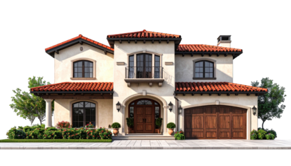 Modern house exterior isolated on transparent background, contemporary home design with wood and stucco facade, architectural rendering