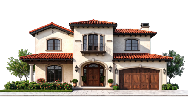 Two-story stucco home with a tiled roof, wooden details, and lush landscaping