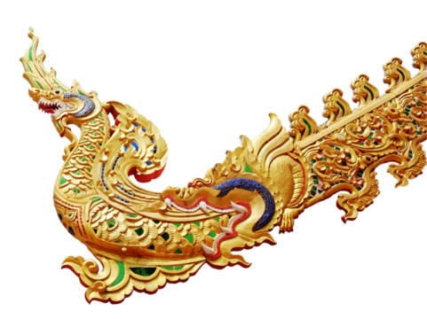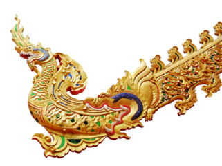 Golden Naga statue and ancient stucco art decorated on roof of Ancient pagoda of buddhism in Thailand
