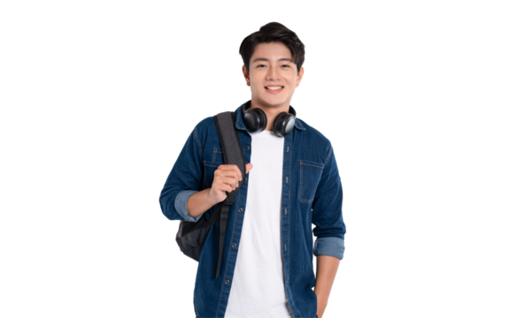 Smiling boy with backpack isolated on white background. Cheerful student portrait for education, back to school, or youth themes.