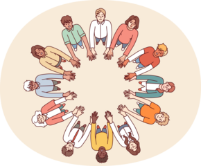 Friendly people stand in circle hold hands for collaboration and teamwork, top view. University students of different gender and race get education together while studying in college